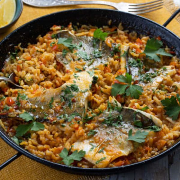 פאייה חגיגית של דג לברק, אורז עגול מלא וירקות העונה עם ציר דגים ויין סוביניון בלאן. 5 מנות.